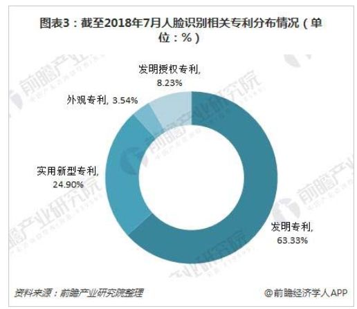 截至2018年7月2日,我國人臉識別技術專利申請總量達到10404項。其中,發明專利數最多,達到6589項,占比為63.33%;實用新型專利數其次,為2591項,占比為24.90%;外觀、發明授權專利數占比分別為3.54%、8.23%。