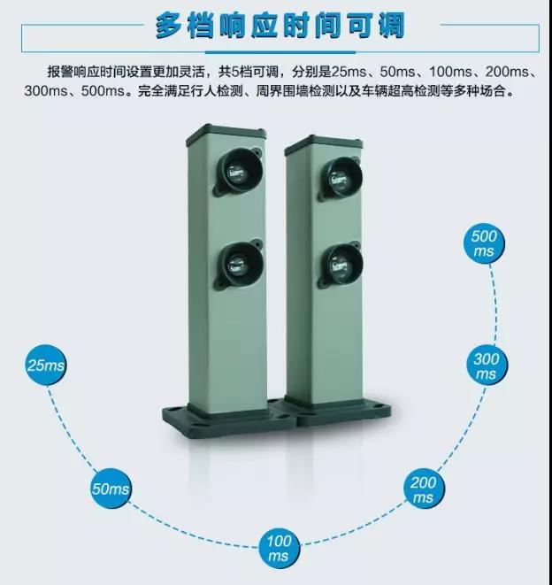 報警響應時間設置更加靈活,共5檔可調,分別是25ms、50ms、100ms、200ms、300ms、500ms。完全滿足行人檢測、周界圍墻檢測以及車輛超高檢測等多種場合。