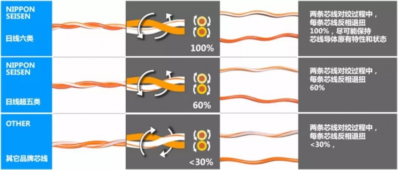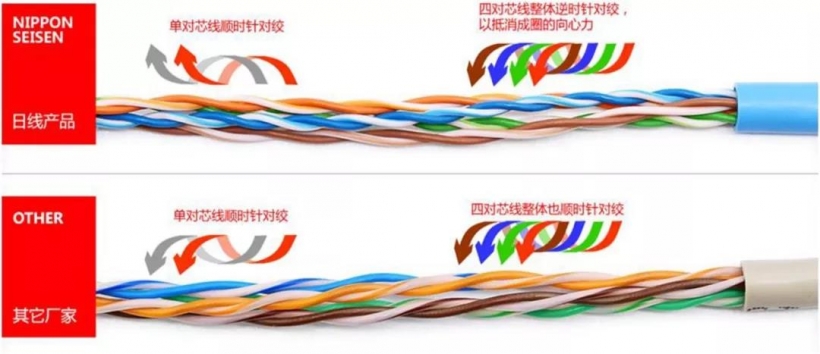 業(yè)界唯一的生產(chǎn)工藝,兩條芯線對(duì)絞過程中,每條芯線反向退扭。單對(duì)芯線順時(shí)針對(duì)絞,四對(duì)芯線整體逆時(shí)針對(duì)絞,以抵消向心力。4對(duì)芯線不易散開,結(jié)構(gòu)更穩(wěn)定,提升信號(hào)傳輸性能和穩(wěn)定性。同時(shí)施工時(shí),線纜拉出包裝箱后,更趨于平直,不容易出現(xiàn)抽線纏繞。