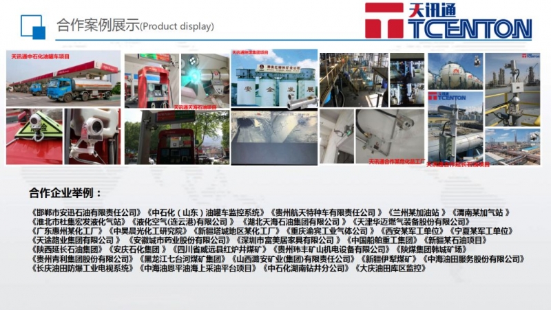 目前,天訊通主要生產(chǎn)的產(chǎn)品有TXQ防爆球型一體攝像機(jī)系列,TX防爆紅外攝像機(jī)系列,TXM微型防爆攝像機(jī)系列,TXK防爆控制箱系列,防爆云臺,防爆護(hù)罩,防爆解碼器等工業(yè)防爆監(jiān)控系列產(chǎn)品,系列產(chǎn)品都已獲得不同等級的防爆合格證,主要應(yīng)用于石油化工工業(yè)、國防工業(yè)、礦產(chǎn)、航天、糧食加工等具有爆炸性危險(xiǎn)的可燃?xì)怏w及粉塵環(huán)境中。