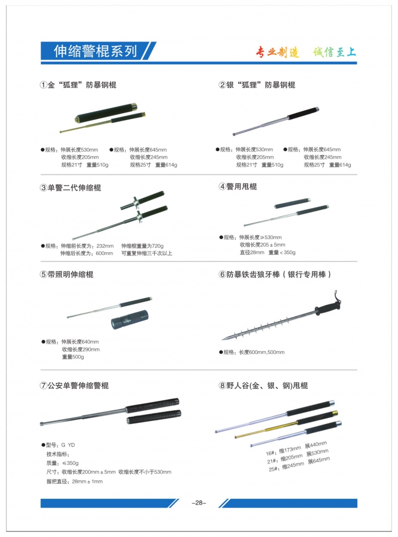 本公司產品包括: 單警裝備、防刺服、防彈衣、鋼叉、多功能抓捕器,連接式組合式警棍、新標單警伸縮警棍、手拷、多功能腰帶、可視催淚噴射器系列。阻車路障、塑鋼防暴棍、防暴T型棍、多功能腰帶,伸縮防爆鋼叉。防暴頭盔、防水強光電筒、全國深測器等幾大系列百余個品種。