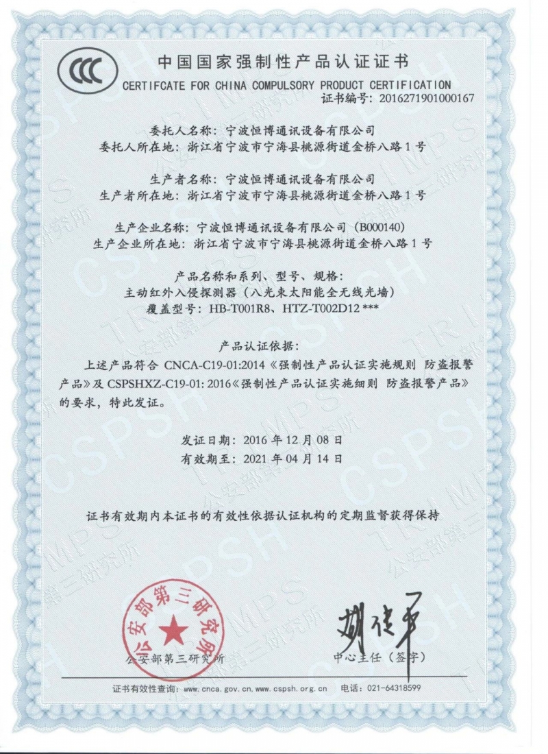 多年來公司致力于發(fā)展家居安防的智能化建設(shè)。于2007年就已獲得“太陽能供電的無線紅外對射”國家實(shí)用新型專利證書,2011年又獲得 “一種紅外對射裝置發(fā)送端的紅外信號(hào)產(chǎn)生方法”國家發(fā)明專利。我公司在不斷的發(fā)展過程中,得到了寧波、寧海等地方政府相關(guān)部門以及西安高新區(qū)有關(guān)部門的大力支持和幫助,取得了眾多的贊揚(yáng)和榮譽(yù),多年來相繼被寧波市科委譽(yù)為寧波市高科技創(chuàng)新企業(yè)、可連續(xù)投資企業(yè)、高科技苗子型企業(yè)、市雙軟企業(yè)等。所研發(fā)的產(chǎn)品通過多年的應(yīng)用和不斷改進(jìn),安全穩(wěn)定性得到了廣大用戶的認(rèn)可和好評(píng)。2010年取得了自營出口權(quán),產(chǎn)品目前已出口到歐美等三十幾個(gè)國家。