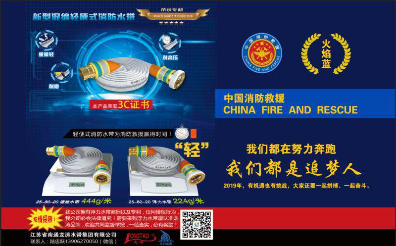 公司具備生產(chǎn)消防水帶最為先進的整套設(shè)備和檢驗儀器,在習(xí)近平科技是“國之利器”的戰(zhàn)略思想指導(dǎo)下,先后取得了具有自主知識產(chǎn)權(quán)50多項,并在深入消防部隊的調(diào)研過程中,以及和消防科研專家的研討中,特別注意到如何在提高消防水帶質(zhì)量和安全系數(shù)的同時,最大限度地減輕消防水帶重量作為重要議題,而且在消防訓(xùn)練和救火過程中,由于消防水帶的磨損造成耐壓值的下降,彎曲、車壓、倒伏等局部壓力增高造成爆管,現(xiàn)場鋒利物割傷和化學(xué)物腐蝕造成破損等等,消防水帶成為了消防部隊的最大易耗品,如果不加以創(chuàng)新提高就不能滿足消防部隊在復(fù)雜火災(zāi)環(huán)境下,高質(zhì)量地滅火和生命保護及救援,我們作為消防水帶高端制造者將責(zé)無旁貸,于是在公安部上海消防科研所專家的精心指導(dǎo)下,我們公司科研技術(shù)人員的全力研發(fā),于2017.03.13日申請了國家發(fā)明專利《一種高壓耐磨輕便消防水帶》,至后在此專利基礎(chǔ)上先后申請了5個實用新型專利,使技術(shù)和質(zhì)量得到了不斷提高,知識產(chǎn)權(quán)的保護網(wǎng)越織越密,也保護了使用者的合法使用權(quán)益;國家發(fā)明專利《一種高壓耐磨輕便消防水帶》的誕生,標志著龍濤牌消防水帶挑戰(zhàn)“重量減半壓力倍增”的不可能而成為現(xiàn)實,于是該發(fā)明專利的論文在中國消防迅速發(fā)布,科研成果得到了公安部消防局的認可,超國標的30、40、50、60、70、80型號65、80規(guī)格的消防水帶,通過了國家消防裝備質(zhì)量監(jiān)督檢驗中心檢驗合格,于是江蘇省消防總隊的相關(guān)消防支隊,紛紛列入試用龍濤牌專利消防水帶的行列;公安部消防局要求全國消防部隊優(yōu)先使用科技成果,于是在全國消防部隊形成消防水帶首選龍濤專利消防水帶的熱潮,由于龍濤牌專利消防水帶在高壓質(zhì)輕以及防割、防腐、抗靜電、抗紫外線、抗沖擊等方面的不可替代性,按照政府采購法的規(guī)定可以申請“單一來源采購”,因此全國消防部隊紛紛以尊重和保護知識產(chǎn)權(quán)為已任,,國家機關(guān)率先示范維護專利法規(guī)的要求,申請了龍濤牌專利消防水帶“單一來源采購”并獲得了成功,我們公司將全力為消防部隊提供服務(wù)。