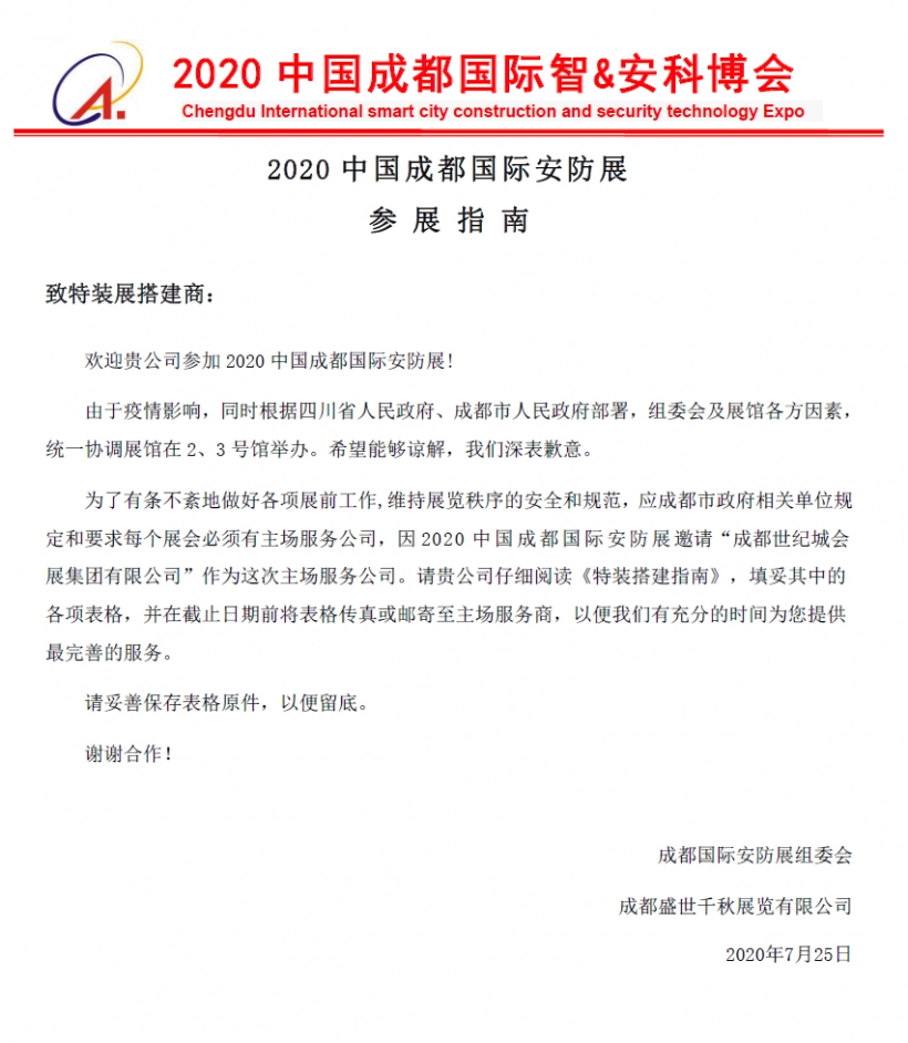 為了有條不紊地做好各項(xiàng)展前工作,維持展覽秩序的安全和規(guī)范,應(yīng)成都市政府相關(guān)單位規(guī)定和要求每個(gè)展會(huì)必須有主場服務(wù)公司,因2020 中國成都國際安防展邀請(qǐng)“成都世紀(jì)城會(huì)