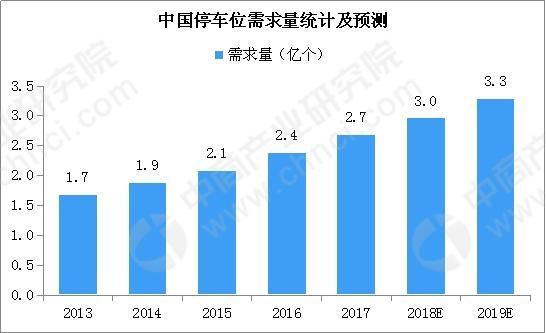 據中商產業研究院預測,2018年我國停車位需求將近3億個。隨著汽車保有量的進一步提高,到2019年停車位需求或將達3.3億個。